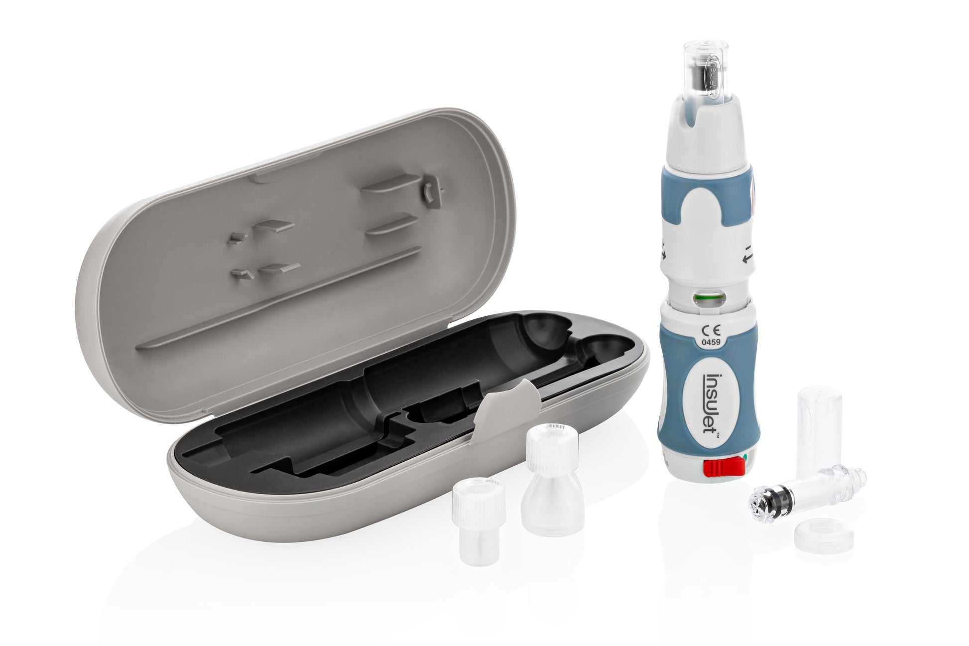 Microjet insulin delivery: Applied to the skin, InsuJet™ delivers insulin under pressure via a fine stream that easily penetrates the skin.