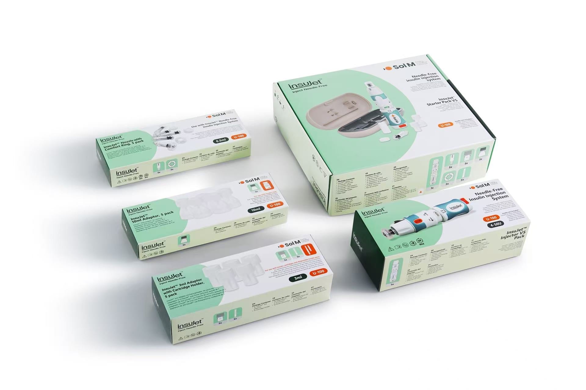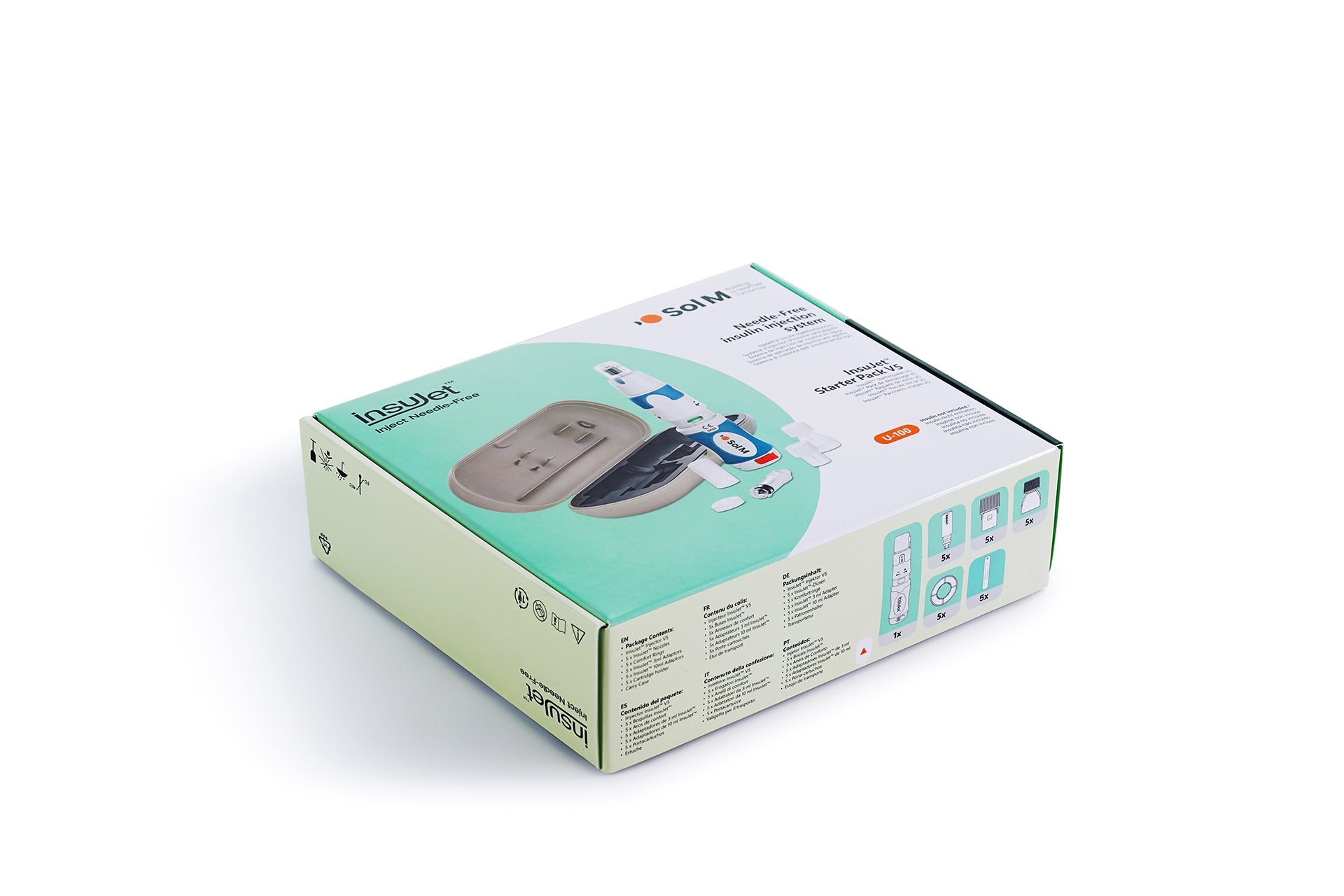 One box of InsuJet™ nozzles and comfort rings (5 units of each) – usable for 56 injections or 14 days.